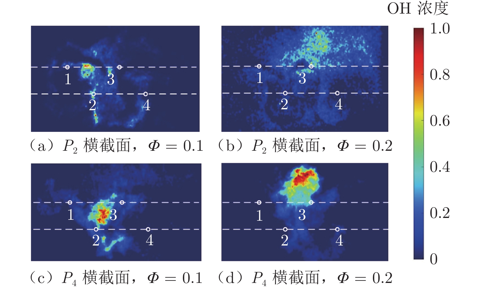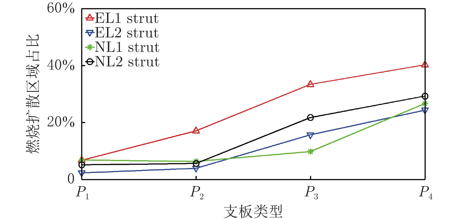 2 ignition combustion, the generated amount and diffusion area of OH reflected that EL1 strut had a better effect on improving the combustion efficiency, and it also reflected from the side that EL1 strut was the best of four kinds of struts.